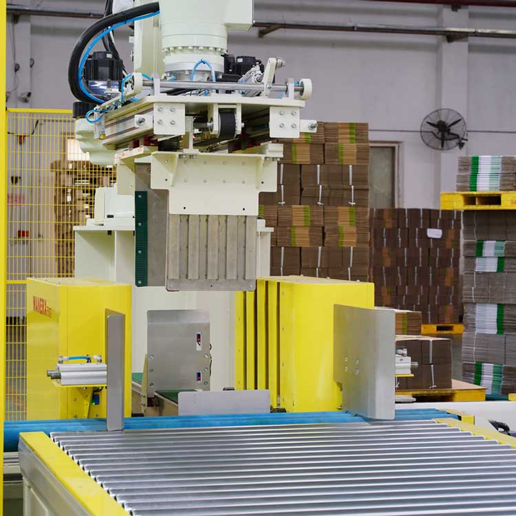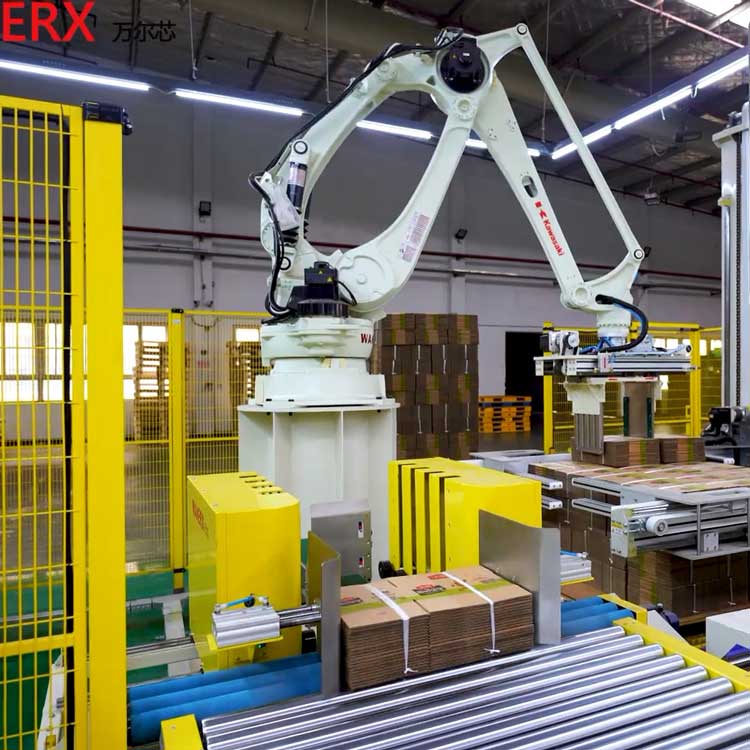 顶升抓取机构带有置中、叠包功能,可配合前叠包平衡国产麻豆精品久久效率;专业设计的纸板夹具带有防止了脱钩,可有利夹取放置一层或两层纸箱防掉落;机器人采用四轴式Kawasaki机械手臂兼顾性能与成本,将纸箱按自定义的垛型自动码放到托盘上。